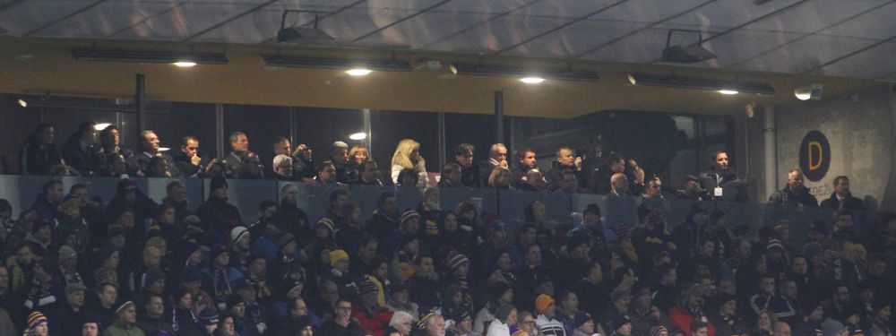 Protokolarna loža na štadionu Ljudski vrt med tekmo Maribor - Schalke: v prvi vrsti poleg Mira Cerarja in Vesne Györkös Žnidar sedijo tudi Toni Balažic, predsednik uprave Mercatorja, Ivica Todorić in Clemens Tönnies. Za Cerarjem pa predsednik uprave Zavarovalnice Maribor David Kastelic, malce levo pa predsednik NK Maribora Drago Cotar (za povečavo klik na sliko).